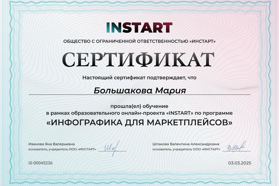 Я сторонница идеи того, что работа должна приносить не только заработок, но также знания, опыт и профессионализм. Эти качества в сочетании с занятием любимым делом - гарант успеха и стабильности на рынке маркетинга продаж и услуг. Когда-то я начинала с простого: училась на своих ошибках и самостоятельно познавала искусство инфографики. Однако в 2025 году я решила сделать осознанный шаг на пути освоения профессии графического дизайнера и окончила соответствующее обучение. Теперь я готова делиться своим опытом и с Вами уважаемые клиенты. Желаю Вам успехов в продажах и надеюсь на совместное сотдуничество!